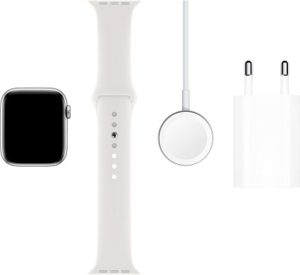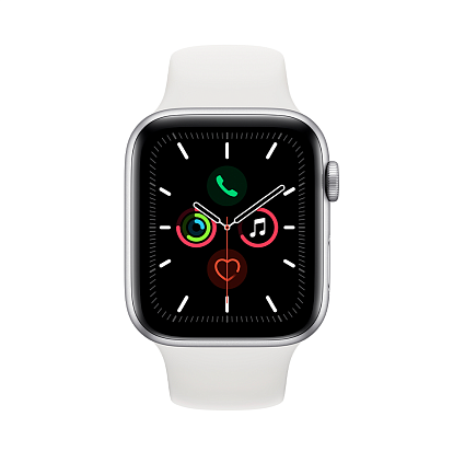 - Короткое название Умные часы Apple Watch Series 5, 44 мм, алюминий серебристого цвета, спортивный ремешок белого цвета